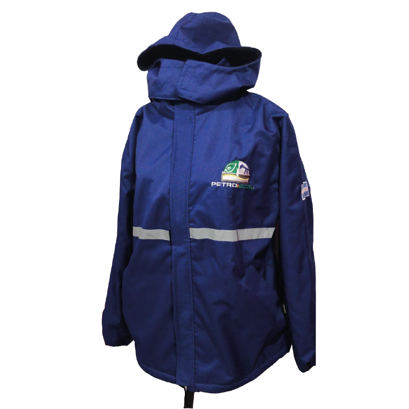 Tela trucker interior en polar, tapa cierre, capucha desmontable, cinta reflectiva, 2 bolsillos, bordado frente, dorso y manga.