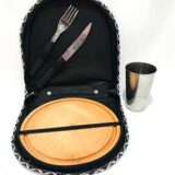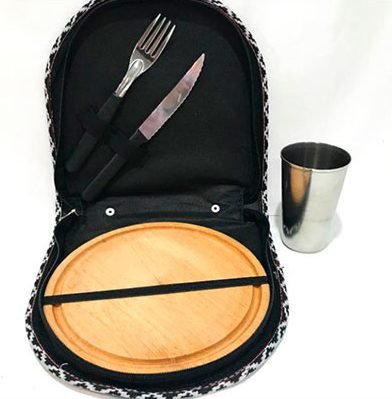 Incluye plato de algarrobo de 20 cm, vaso y cubiertos Carol con mango de plástico negro