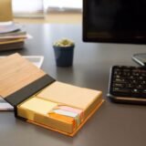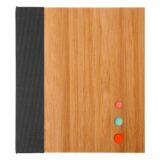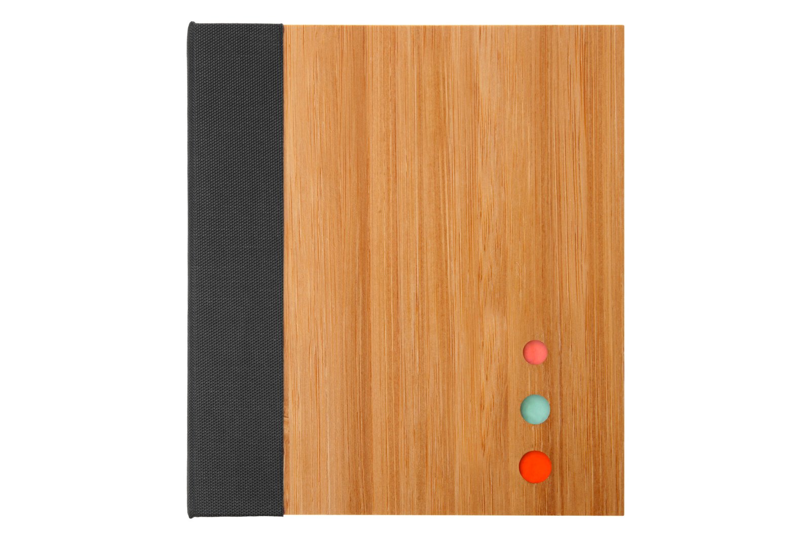 Bambú. 12 x 10,5 x 2 cm. Contiene post-it de diferentes tamaños, uno rectángular de papel reciclado, otro pequeño de color y 3 en forma de flecha. Tapas de bambú, lomo en tela negra, divisiones internas en plástico.